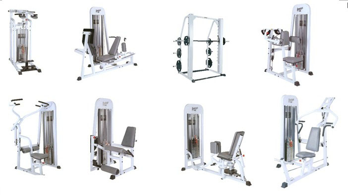 二头肌训练机、腹背训练机、高拉训练机、高位蝴蝶机、平推胸训练机、上斜推胸机、史密斯机、提肩训练器、腿部内外弯机、腿部伸展机、腿部推蹬机、下拉训练机、小腿训练机、坐姿划船训练机、坐姿推举训练机、坐姿推胸训练机、单人站综合训练器、二人站综合训练器、四人站综合训练器、五人站综合训练器、综合训练器(四方位三配重)、;哑铃/彩色哑铃/排式哑铃/塔式哑铃架 、调节式哑铃练习平椅、多功能举重床 、杠铃举重床 、弧形腹肌板 、可调式腹肌板 、屈臂训练凳 、拳击不倒翁/拳击沙袋、哑铃练习平椅、腰背训练凳。